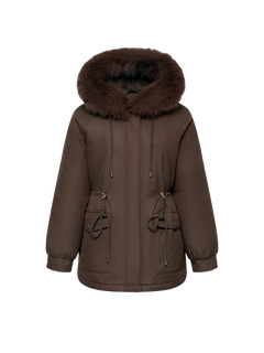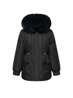 WarmCore™ Faux Fur Mid-Length Hooded Drawstring Parka With Adjustable Waist Belt Desig